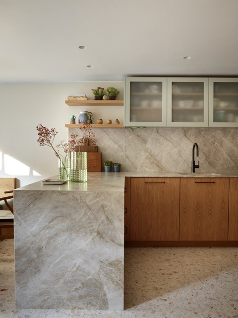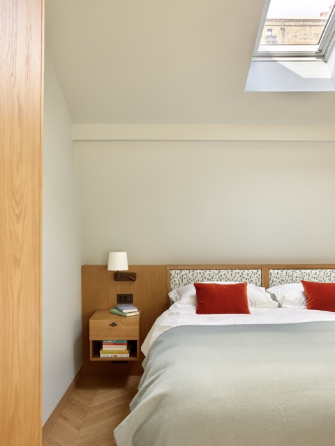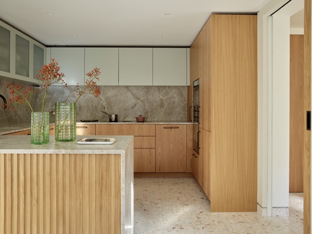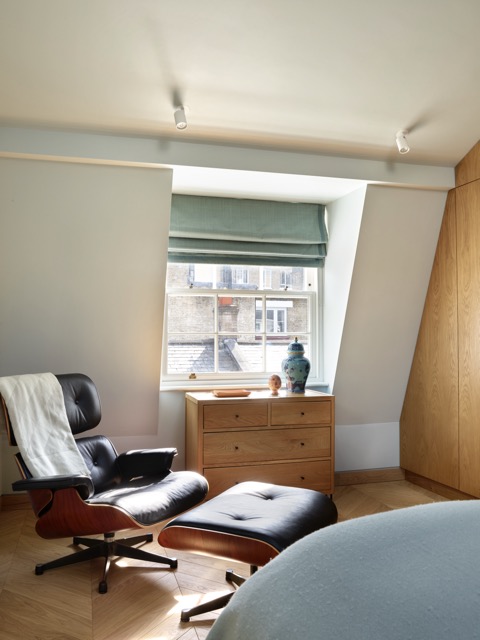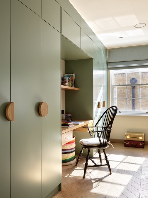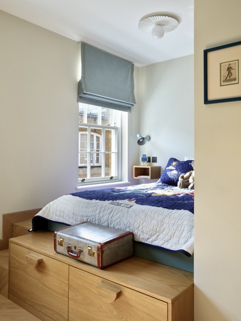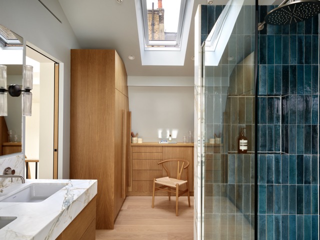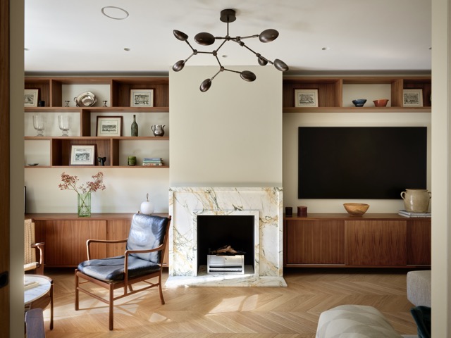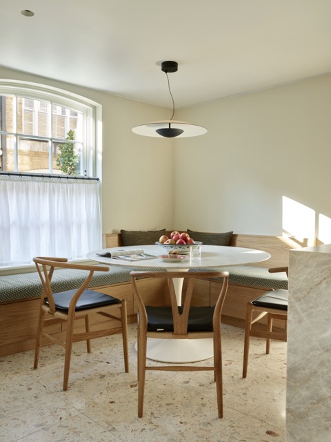 Für eine junge kanadische Familie wurde dieses kompakte Mews-Haus in Marylebone umfassend umgestaltet. Die Raumaufteilung auf allen Etagen wurde neu gedacht, um mehr Licht, Funktionalität und Wohnqualität zu schaffen. Im Erdgeschoss bringt eine neu ausgerichtete Küche mit Glasabtrennung Tageslicht tief ins Haus, während eine Einbaubank mit Esstisch eine geschützte Nische bildet.