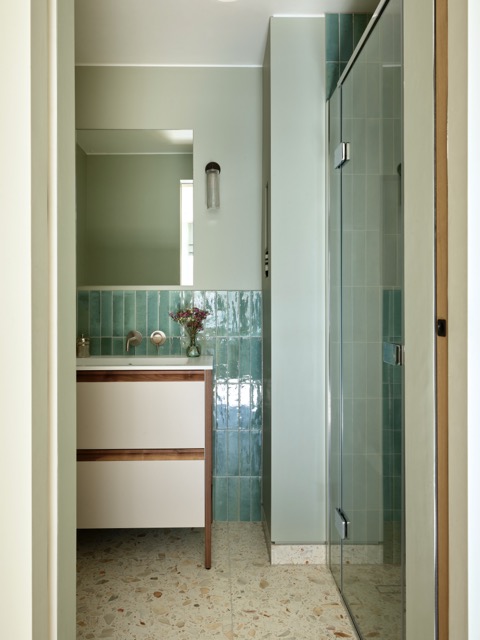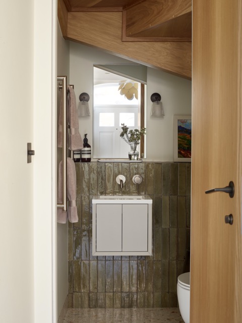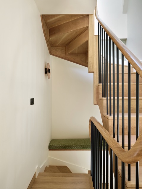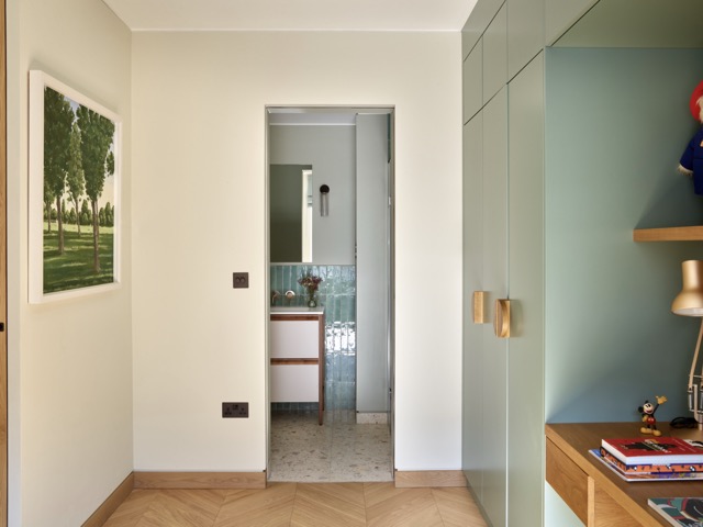 Im Obergeschoss wurde eine Galeriefläche geschlossen, um ein grösseres Kinderzimmer mit erhöhter Schlafnische zu schaffen. Schiebetüren und höhere Türöffnungen sorgen für vertikale Grosszügigkeit. Das Dachgeschoss bietet nun ein grosszügiges Masterbad mit Ankleide sowie ein kleines, gut belichtetes Homeoffice.